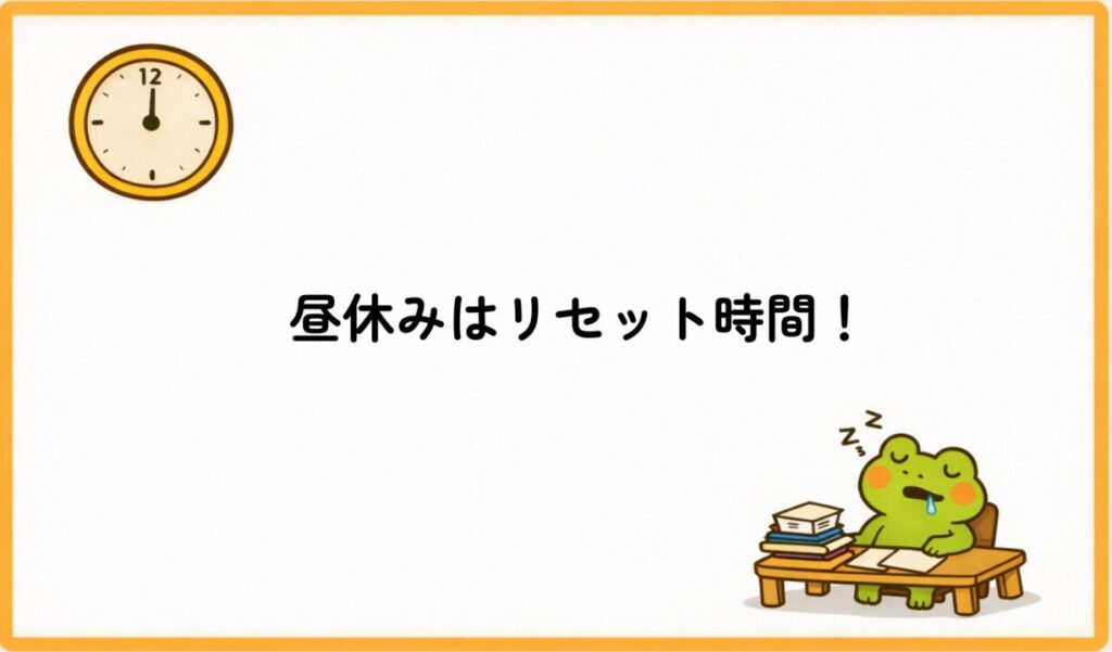 - 集中力が落ちやすい午後に向けて昼休みは、「リセットの時間」として使う。