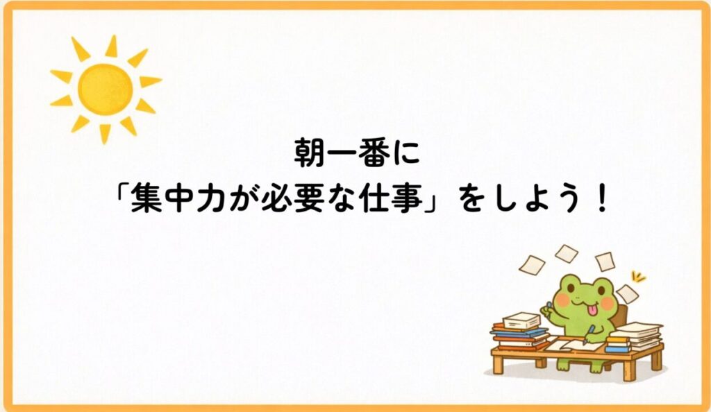 - 朝の時間帯に「今日いちばん集中力が必要な仕事」に取り組む。